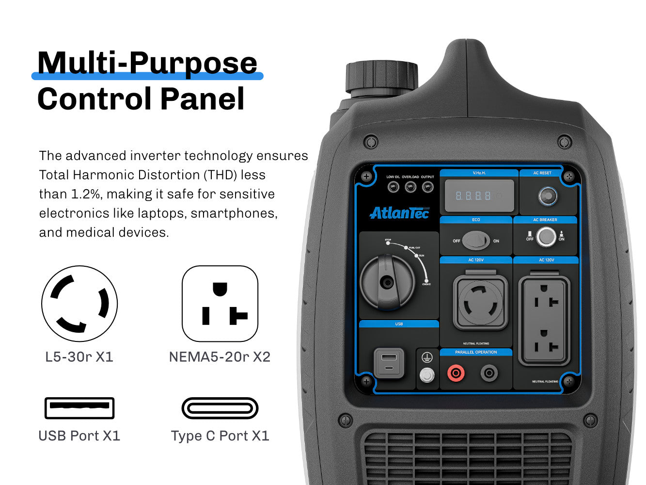 • AT5000i design runs on gasoline (4000 max watts, 3800 rated watts)