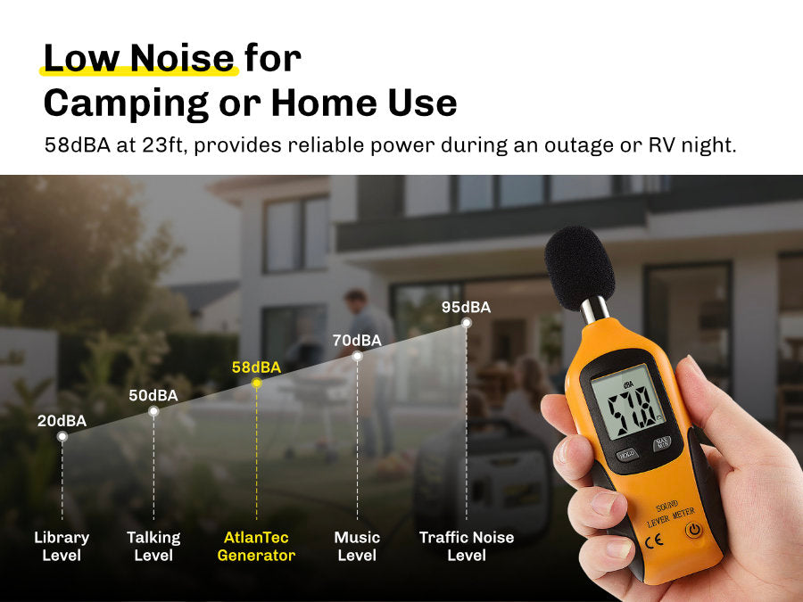 ăQuiet Generatoră- Ultra-quiet operation at just 57 dBA at 23ft. Perfect for campgrounds, RV parks, and residential areas. Eco Mode dynamically adjusts engine speed to optimize fuel efficiency and reduce noise.