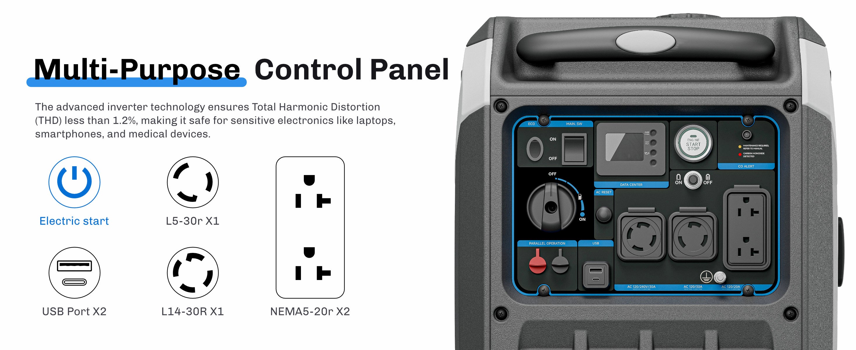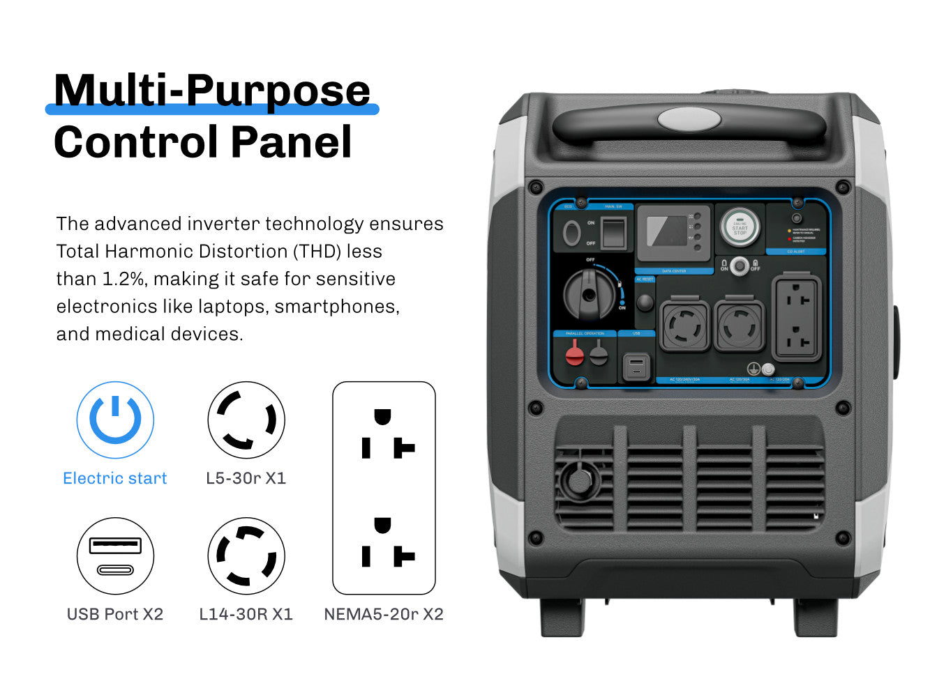 Includes fuel shut-off to help limit maintenance, onboard wheels, a telescoping pull handle, one L14-30R 120V/240V receptacle, two three-prong 120V receptacles, one TT-30R RV receptacle, one 12V DC receptacle, two 5V USB ports, a voltage selector switch, a tool-free LPG quick-connector, a six-foot-long LPG regulator hose, and a one-year warranty